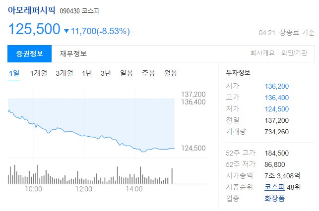 3월 16일 122,200원 최저점을 찍고 중국 리오프닝 관련주로 시장의 관심을 받아 지속 상승해왔는데요. 하지만 4월 20일 한중의 첫 번째 설전에 잠시 내려가더니 오늘 두 번째 설전에 이어 8% 넘는 급락을 나타냈습니다. 아모레퍼시픽은 화장품 관련주로 중국의 경제 개방에 많은 수혜를 볼 것으로 예상되는 종목인데 오늘 직격타를 맞은 셈입니다.