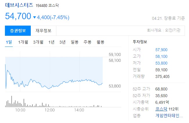 쿠키런 등 중국 출시 기대와 함께 저평가된 기업으로 투자의견 매수와 목표주가 상향으로 시장의 관심을 받았던 게임업체 데브시스터즈 역시 넥슨게임즈와 함께 큰 하락폭을 받았습니다. 8% 가까운 수치를 보였으며 최근 상승폭을 고스란히 반납하였습니다. 이 또한 같은 이유로, 중국의 게임 문호 폐쇄에 대한 우려가 큰 영향을 보였습니다.