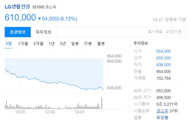 아모레퍼시픽과 함께 화장품 분야에서 중국 리오프닝 관련주로 가장 많은 영향을 받는 종목인 LG생활건강 입니다. 차트 또한 두 회사가 비슷하게 갑니다. 3월 16일 저점 이후 개방 기대감과 함께 계속 끌어올렸던 차트 어제부터 주저앉았고 오늘도 8%를 다소 넘게 반납한 상황입니다.