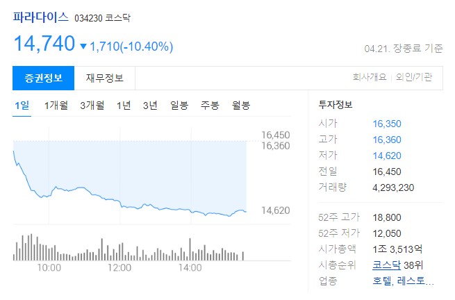중국인들의 방문 기대에 카지노 및 호텔 관련주도 상당한 영향을 받았죠. 그 중 대표적인 종목이 파라다이스입니다. 이번 이슈로 인해 그동안의 기대가 한순간에 무너져 10% 넘는 급락을 경험한 상태입니다. 거의 작년 10월 수준으로 주가가 돌아간 상태이므로 다른 종목에 비해 그 정도가 심합니다.