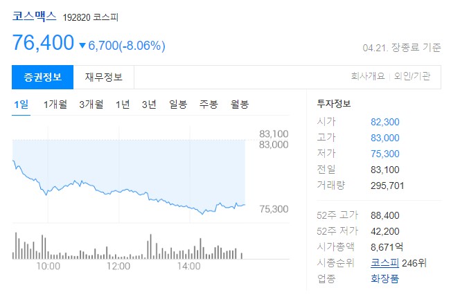 마지막으로 화장품 OEM 제조 업체인 코스맥스 입니다. 화장품 대장주 포함 대부분의 약 8%대의 급락을 경험한 상태입니다. 오늘의 하락장은 시장에서 일시적인 것이라 보고 있지는 않습니다. 이번 주말 한중에서 어떠한 반응을 보일지에 따라 월요일 주가 변동폭을 예상할 수 있는 만큼 양국의 입만 바라봐야 하는 상태와 같습니다.